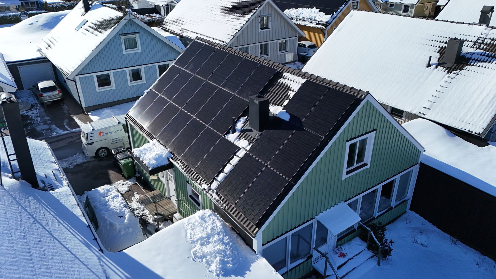 Villa i motala där takbyte samt installation av Solarstone Full solar roof paneler på 420W installerats. Takbryggor och ventilation har byggts om och skorsten har flyttats till norrsidan för bättre utnyttjande av södersidan. 36 st paneler mot söder och 28 st mot norr. Dummypaneler i aluminium och samma utförande som solpanelerna används för montering av skorsten, ventilation, bryggor och snörasskydd. Samt ett enhetligt utseende. Växelriktare från Fronius och batteri från BYD lagrar strömmen och minimerar köp av ström. Även ö-driftfunktionalitet med automatiskt tillslag finns installerat.