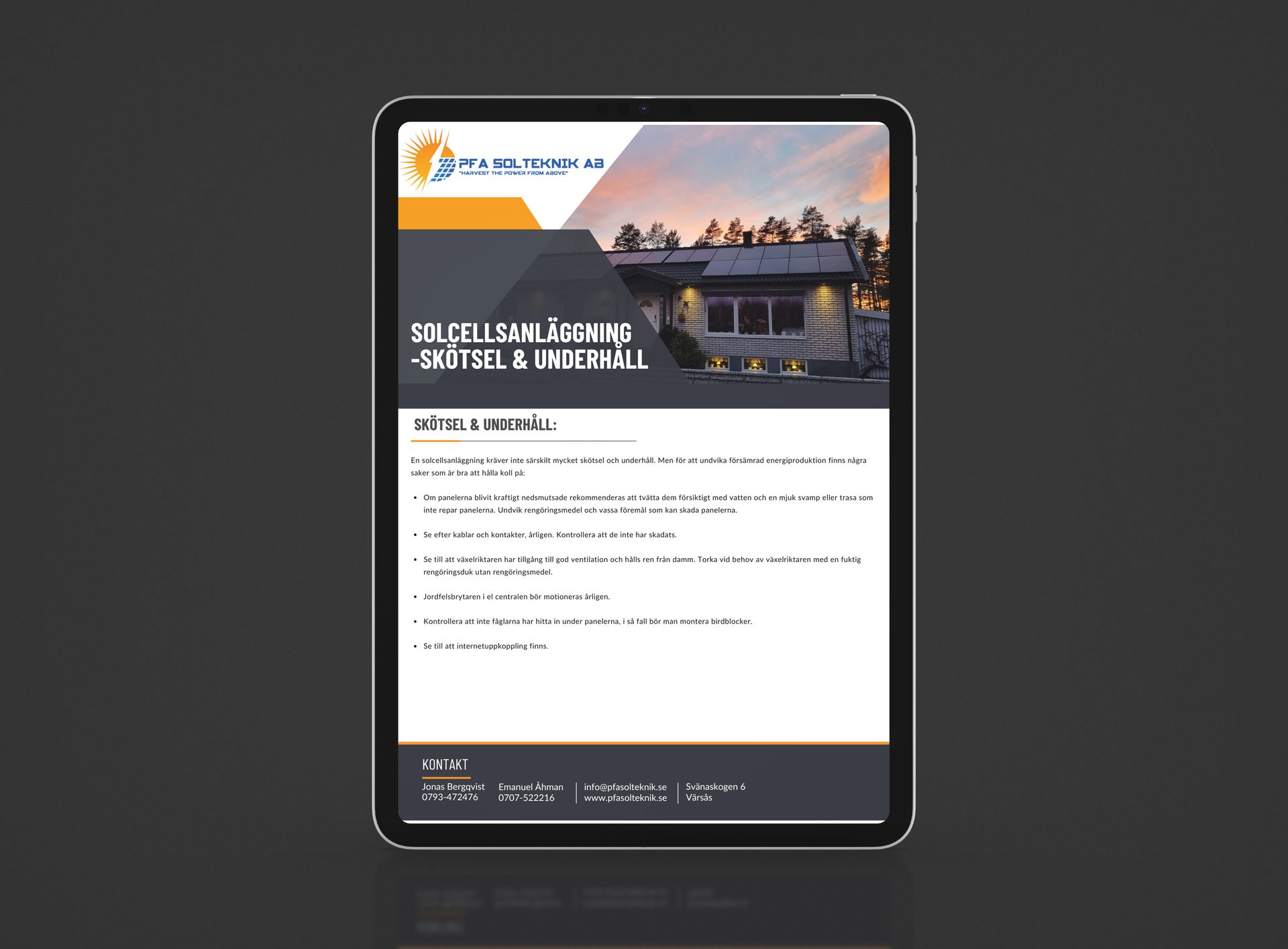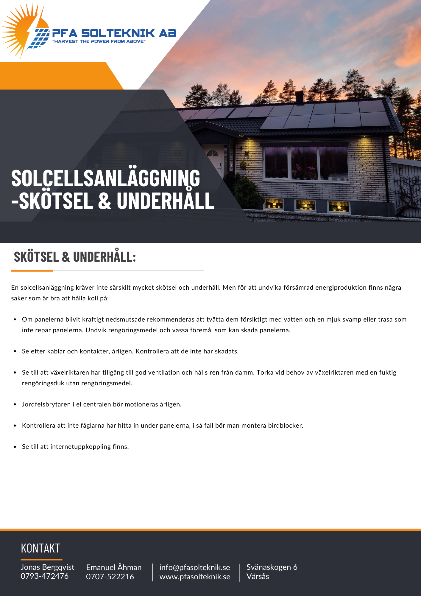 En solcellsanläggning kräver inte särskilt mycket skötsel och underhåll. Men för att undvika försämrad energiproduktion finns några saker som är bra att hålla koll på: